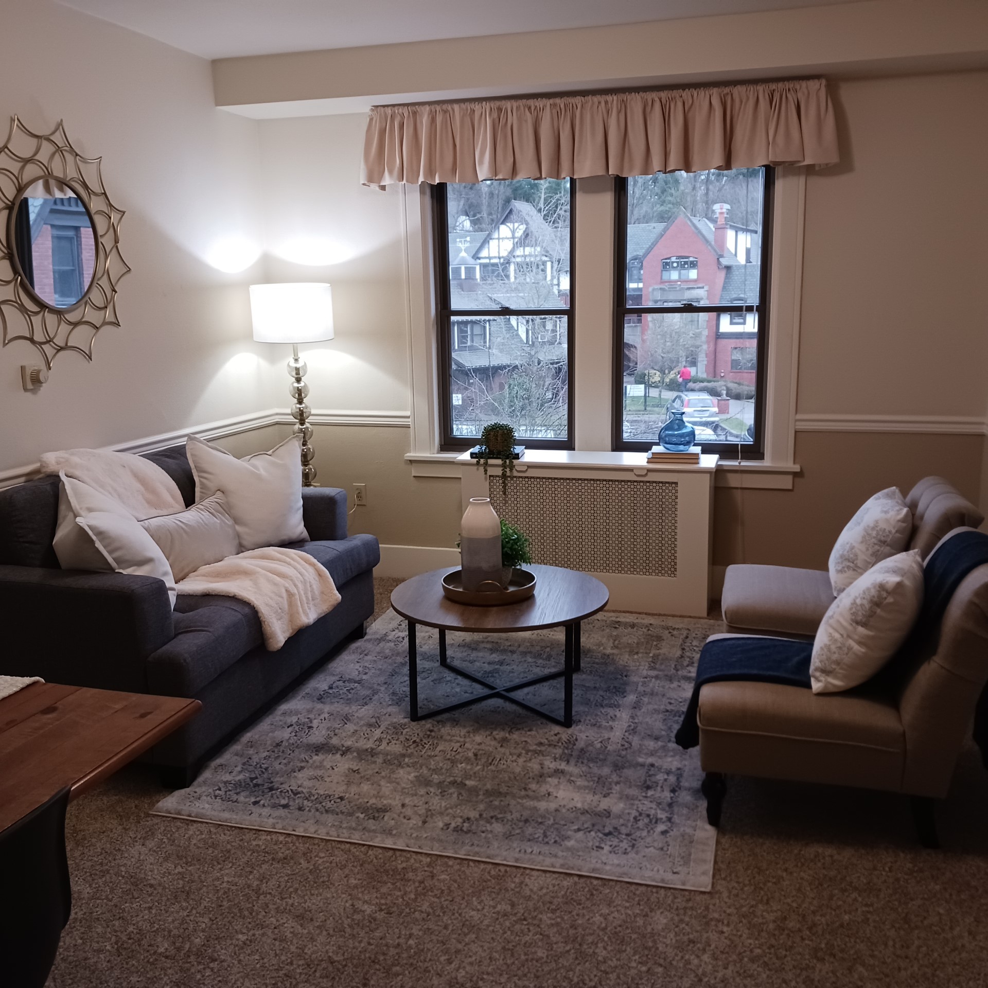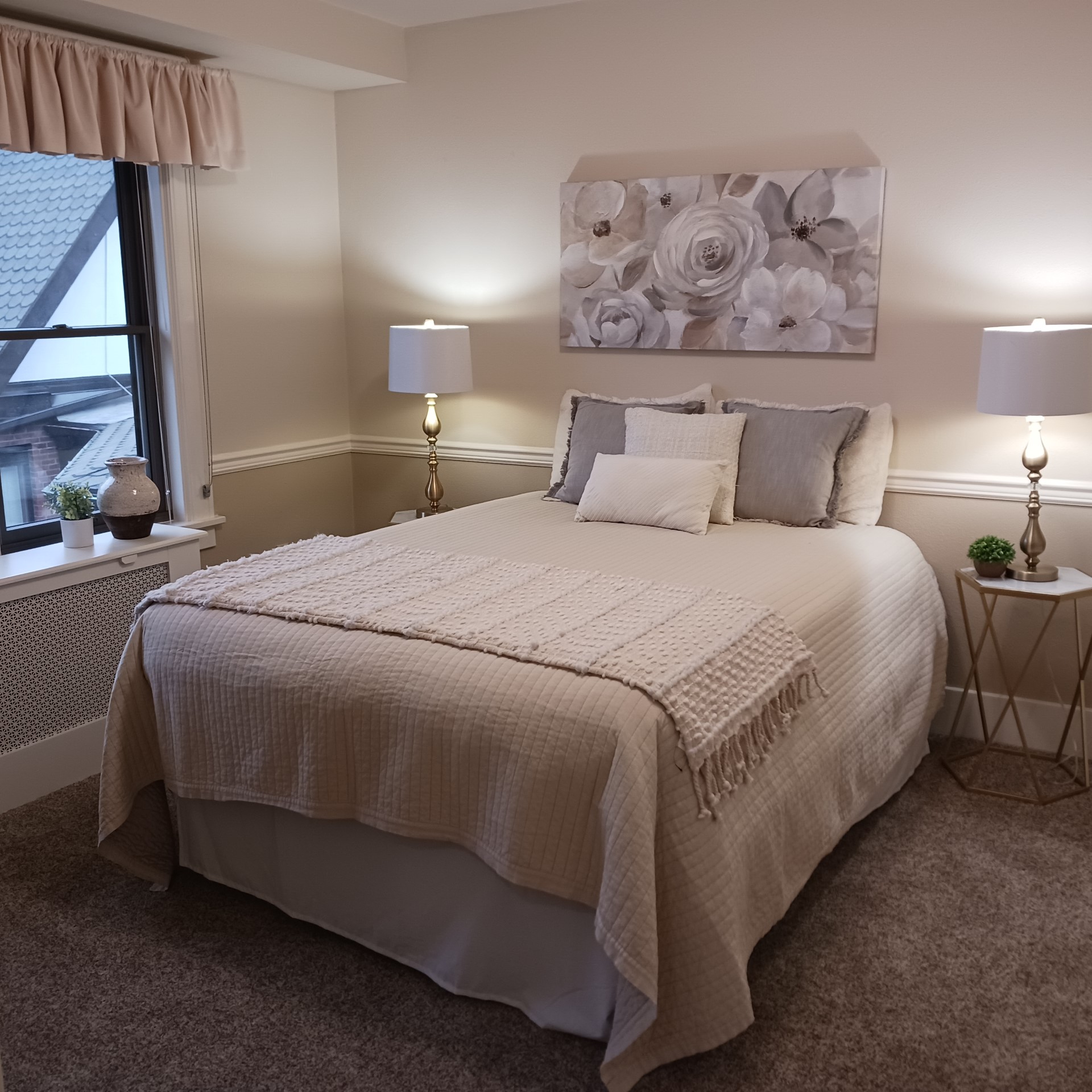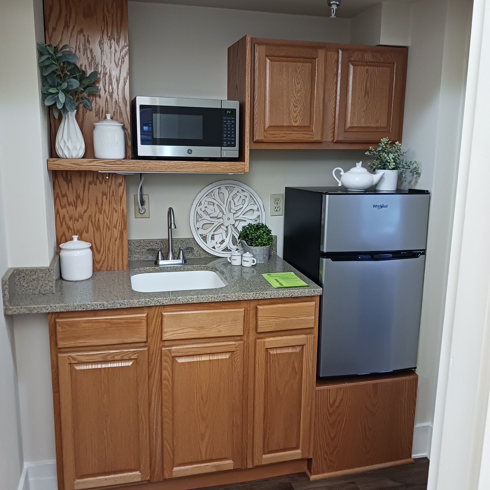 This one bedroom, one bathroom apartment has a convenient kitchenette and overlooks BB’s Garden. The monthly rent of $4,515 (no buy in) includes: